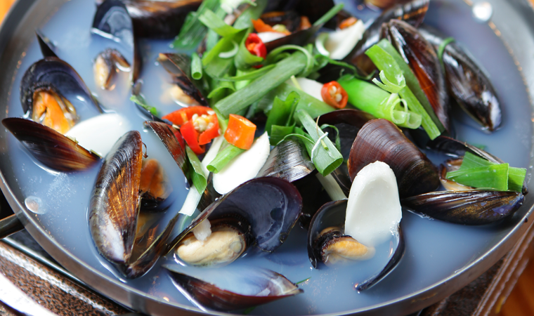 손질한 홍합을 팬에 넣고 홍합이 잠길만큼 물을 붓는다.